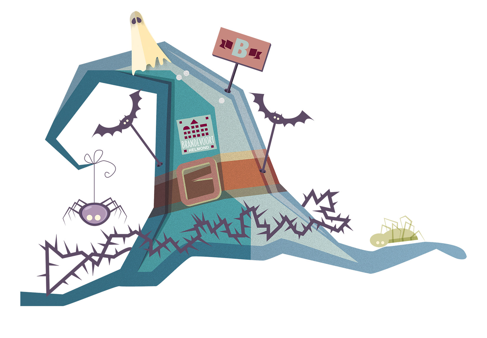 Series of five illustrations for the benefit of city promotion in the field of sport (represented by a BMX helmet), celebrations (Haloween), public transport (public transport cap), architecture (wig with architectural homes) and festivals (Dickens top hat).